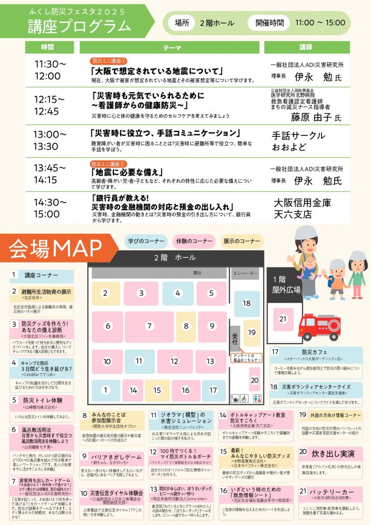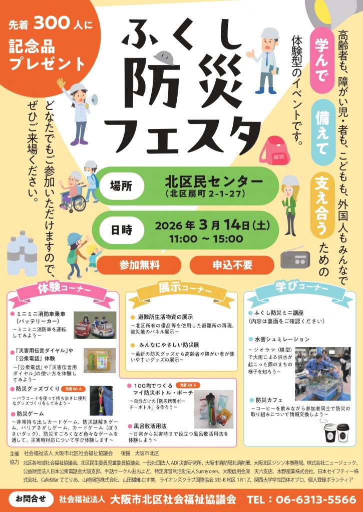 災害時や避難時の高齢者・障がい児者・子ども・外国人等に役立つ体験型イベント。ふくし防災ミニ講座や災害伝言ダイヤル体験会、防災グッズづくり、防災ゲーム等、学んで・備えて・支え合うための“やさしい防災”をぜひ一緒に体験してみませんか?ミニミニ消防車(バッテリーカー)の乗車もできます!